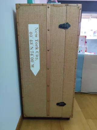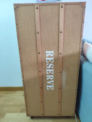 Este mueble tipo bar o botellero tiene un diseño único con la palabra RESERVE impresa. - Acabado en yute y madera. - Detalles metálicos en las esquinas y bordes. - Diseño vertical y estilizado. Tiene una zona arañada por los gatos como se ve en la última foto
