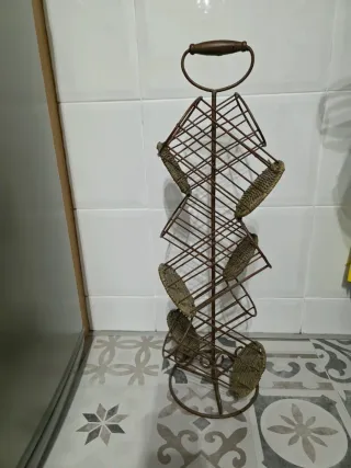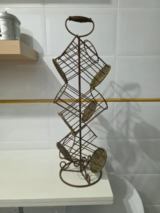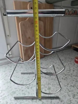 Soporte para 6 botellas, fabricado en metal cromado, resistente y estable. Ideal para cocina, despensa o zona de bar. Diseño vertical que ocupa poco espacio. Medidas aproximadas visibles en las fotos. Usado, pero en perfecto estado de conservación, sin óxido ni desperfectos relevantes.