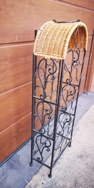 Elegante botellero de hierro forjado con detalles en mimbre. Su diseño vertical lo hace ideal para cualquier rincón. - Estructura metálica resistente. - Soportes de mimbre para botellas.