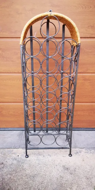 Elegante botellero de forja con capacidad para 24 botellas. - Diseño vertical y estilizado. - Acabado en color negro. - Fabricado en metal resistente. Necesita algún retoque en el extremo de las patas que muestro fotos, por eso el precio rebajado