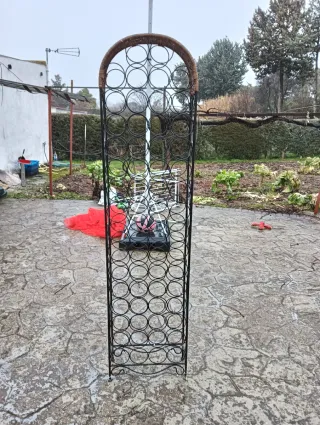 Elegante botellero de hierro con capacidad para varias botellas. - Diseño vertical y estilizado. - Estructura robusta.