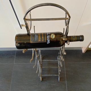 Botellero forjado metálico, porta botellas de vino o como simple decoración. Medidas: 30 cm largo x 24 alto. En perfecto estado.