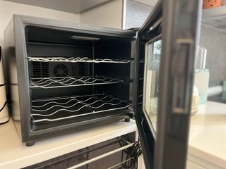 Vinoteca de sobremesa con capacidad para 12 botellas. Ideal para mantener tus vinos a la temperatura perfecta. - Diseño compacto y elegante. - Estantes cromados. - Puerta de cristal.
