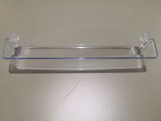 Botellero de plástico transparente para la puerta de la nevera. Ideal para organizar bebidas. Medidas: 44cm en la parte más larga, 42,4cm para enganchar, Por 9,8cm de profondo y 9cm de alto. Referenciada como 4FGRJ4088416 En la página web eSpares de recambio de accesorios.