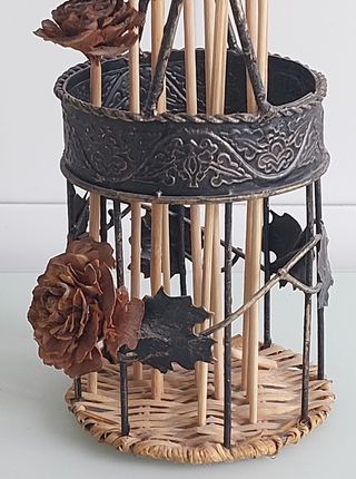 Decoracion floral se puede utilizar para botellero quitando las flores Vintage anterior a los 2000 Materiales: metal, flores secas y mimbre Medidas: Alto38 cm. Diámetro base 11 cm. Las flores secas tienen "desperfectos" por que son naturales y secadas tradicionalmente