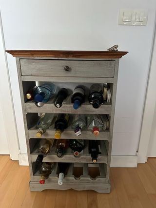 Mueble de madera con capacidad para botellas de vino. - Diseño rústico y funcional. - Tiradores dorados. - Dos cajones superiores.