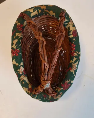 Cesta de mimbre con un diseño rústico y asa para transportar. (La botella vacía de la foto no está incluida) - Tejido interior con estampado de acebo y bayas rojas. - Asa de mimbre trenzado.
