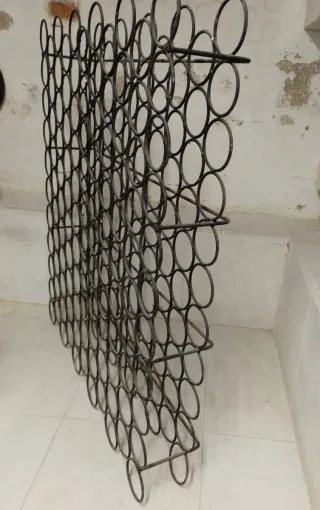 Botellero de forja artesanal con un diseño único. Resistente y con capacidad para 116 botellas. Aros forjados. Para fijar en la pared mediante escarpias y apoyadon en el suelo. Ancho. 95 altura 110 fondo 18 No incluye transporte