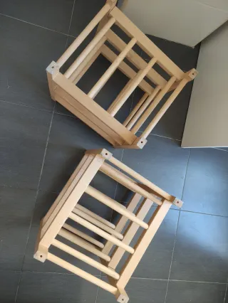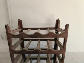 Práctico botellero de madera maciza para organizar tus botellas, de 9 botellas cada uno. Apilables como se muestra en la foto - Diseño de varios niveles. - Construcción robusta.