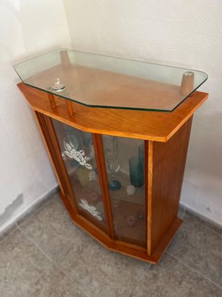 Se vende preciosa vitrina vintage en buen estado, de madera clara con elegante grabado floral y cristal. Ideal para decoración o almacenamiento con estilo. Incluye dos juegos de copas y botellero de regalo. Único desperfecto: pequeño daño en el cristal de la parte superior, apenas visible y no afecta a su uso (está adjuntada una foto) Precio: 80€. Se puede ver sin compromiso.