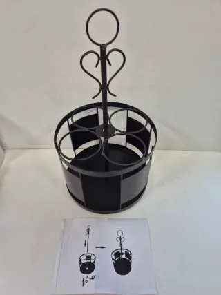 Bonito botellero de forja para 12 botellas. Tiene un diseño elegante y se encuentra en buen estado, nuevo. - Estructura resistente de metal. - Asa de madera. - Capacidad para 12 botellas.