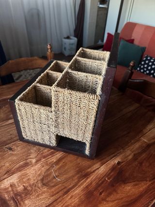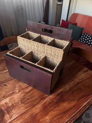 Práctico botellero con capacidad para 6 botellas. Su diseño combina madera y mimbre, aportando un toque rústico a tu hogar. - Estructura de madera oscura. - Cestas de mimbre. - Asa para facilitar su transporte.