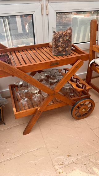 Carrito camarera de madera con botellero y portavasos. Ideal para servir bebidas y aperitivos. - Estructura de madera robusta. - Bandeja superior con listones. - Compartimento inferior para copas y botellas. - Ruedas para facilitar el transporte.