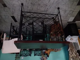 Elegante botellero con una combinación de materiales que le da un toque rústico y moderno. Precio a convenir. Recogida Campanar. Ascensor y rampa. - Estructura principal en metal negro. - Superficie superior de madera en tono marrón.
