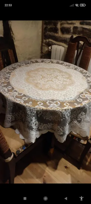 Mantel redondo con un bonito diseño calado. Está en perfecto estado, como nuevo. Circunferencia 150 CMS - Diseño de efecto calado. - Tonos beige y blanco. Muy elegante Lavable