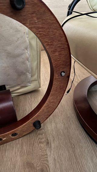 Sillón de masajes con un diseño elegante y confortable. - Tapicería en cuero de color beige. - Detalles en madera de tono marrón. - Estructura circular de madera en la base. -La estructura pequeña le falta un apollo que se perdió, pero apolla igual y no coges ni nada. El resto del sillón esta en muy buen estado, y funciona todo a la perfección, tiene varios programas de masajes, es calefactable y tiene temporizador programable. Cable largo, y mando en buen estado. Tiene muy poco uso Algo negociable.
