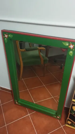 Precioso espejo con marco pintado a mano, ideal para dar un toque de color a tu hogar. Requiere una pequeña restauración. - Marco con diseño floral. - Colores vivos en verde y rojo.