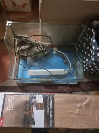 Acuario con decoración rocosa y plantas artificiales. - Base de color azul. - Incluye filtro y luz. - Diseño curvo en los laterales.