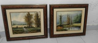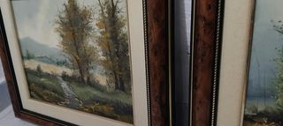 Conjunto de dos cuadros con paisajes. - Marcos de madera con acabado veteado. - Cristales protectores. - Diseños de escenas naturales.
