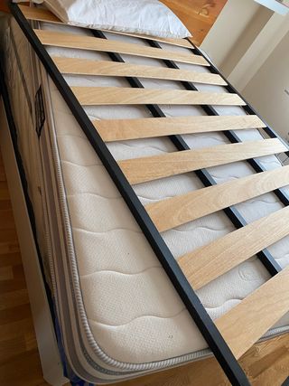 Se vende conjunto de colchón viscoelástico y somier con patas. - Medidas del colchón: 120x190 cm. - Estructura del somier de metal y madera.