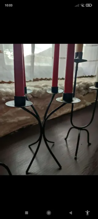 Conjunto de tres candelabros negros a juego. - Fabricados en metal. - Diseño elegante y moderno. - Dos de ellos son iguales para llevar dos velas a diferentes altura - Uno de ellos tiene para colocar cuatro velas centrales - Muy resistentes Sin velas. Hacen un juego perfecto para colocar en cualquier mueble o en mesa en una celebración.
