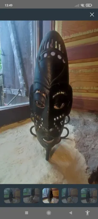 Portavelas de forja grande con un diseño llamativo y un soporte para colgar. -Diseño de cara africana - Soporte trasero para colgar - No incluye vela. - Fabricado en forja Medidas en fotos