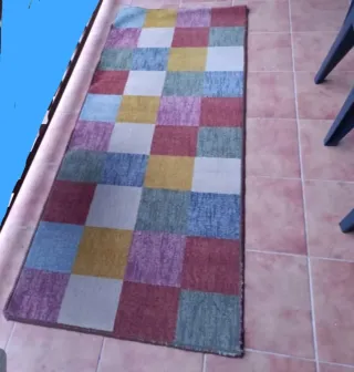 Alfombra con un diseño de cuadros en varios tonos. Ideal para dar un toque de color a tu espacio. 4.20 de largo x0.70 Lo que veis es el doble - Diseño de cuadros. - Estampado multicolor.