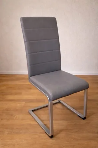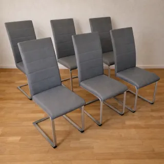 Conjunto de 6 sillas de comedor modernas tipo cantilever, con estructura metálica y asiento/respaldo tapizados en polipiel gris. ✔️ Estructura sólida y estable ✔️ Diseño cómodo y actual ✔️ Respaldo alto ✔️ Peso 7,25 Kg ✔️ Soporta 120 Kg de peso Estado: Buen estado general. Presentan desperfectos normales por uso. Una de las sillas tiene un pequeño pelado de unos 2 cm en el lateral del asiento (ver fotos). Venta preferiblemente en conjunto (consultar) 🚫 No se realiza envío a domicilio. Recogida en mano. Cualquier duda, escríbeme sin compromiso. Vendo en la zona de Cofrentes o Buñol (Valencia)