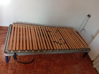 Base de cama articulada con estructura metálica y láminas de madera. - Sistema de elevación eléctrica. - Láminas de madera flexibles. -El eje que mueve la parte que eleva la zona piernas ,tiene una reparación ver foto, pero funciona correctamente. -Tambien tengo el colchón articulado ver en mi perfil