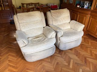 Conjunto de dos sillones reclinables. - Tapicería de tela. - Tonos beige/amarillo