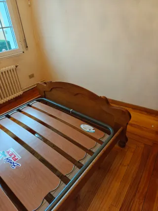 Entrega gratis en Galicia y Asturias. Conjunto de muebles de dormitorio de madera en muy buen estado. Precio negociable. - Dos camas individuales con cabeceros y pies, somiers y colchones. - Mesita de noche con tres cajones. - Cómoda de madera con cuatro cajones grandes. - Gran estantería de madera con baldas. - Lampara de techo y de mesilla. - Espejo. - Armario de cuatro puertas y tres cajones interiores.