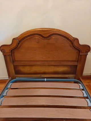 Conjunto de cama y espejo fabricado en madera maciza de castaño. El diseño de la cama presenta un cabecero con detalles tallados y patas ornamentadas. - Estructura de cama de madera. - Espejo a juego.