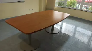 Mesa de conferencias de gran tamaño, ideal para oficinas o salas de juntas. - Superficie de madera. - Base de metal. - Medidas: 220 cm de largo x 110 cm de ancho.