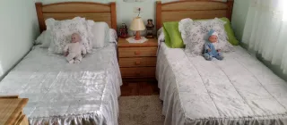 Se vende dormitorio con dos camas de 90 cm. individuales, ideal para habitaciones compartidas o de invitados. - Dos cabeceros de madera. - Dos colchones. - Mesita de noche de madera con cajones.