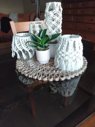Conjunto de tarros decorados con macramé. - Diseño artesanal con cuerdas de yute. - Cristalería con detalles de macramé El precio oscila entre 7 y 10 euro unidad,según trabajo