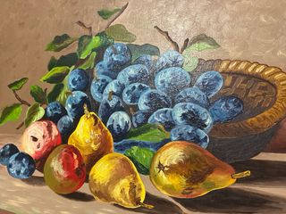 Original pintura al óleo de un bodegón de frutas, creada en 1977. La obra presenta una composición detallada de uvas, peras y otros frutos. - Firmado por M. Betanzos. - Fecha: 30-11-77.