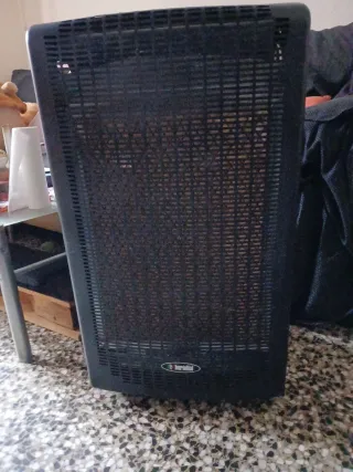 Estufa de gas butano en color negro. - Diseño cilíndrico. - Asa superior para facilitar el transporte.