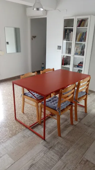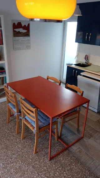 Mesa de comedor con estructura de acero y sobre laminado en color naranja. - Medidas: 78 cm de alto x 140 cm de ancho. - Diseño moderno y funcional.