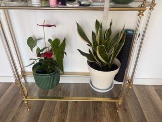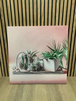 Precioso cuadro decorativo con un diseño de plantas en macetas. -lienzo sobre bastidor de madera - Representación de plantas verdes y flores rosas.medida 50X50