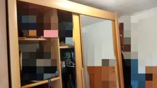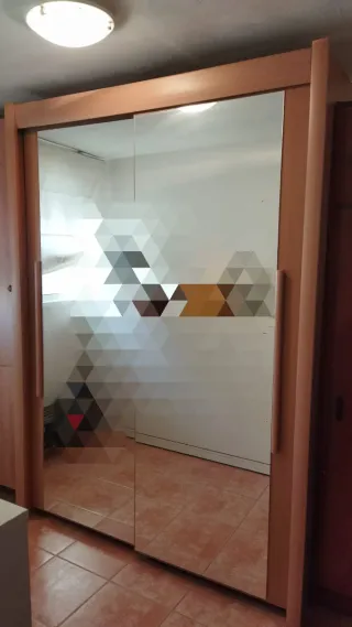 Armario con dos puertas correderas y acabado en espejo. Interior con estantes (5 baldas) 50 cm ancho, barra de 1m para colgar a una altura 160cm, maletero encima del perchero - Estructura de madera. - Puertas de cristal con espejo.