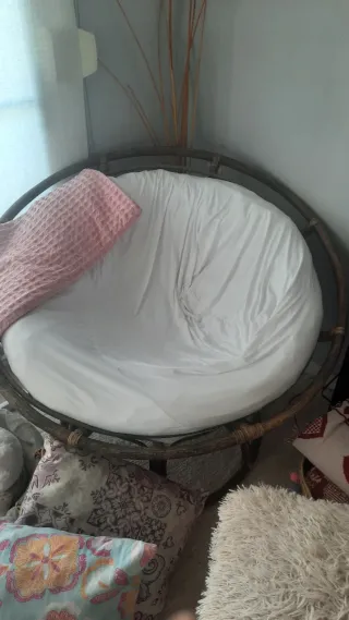 Este sillón redondo es grande y muy cómodo, perfecto para relajarse. Su diseño combina materiales naturales y textiles para un toque acogedor. - Estructura de ratán. - Cojín de tela blanca. - Incluye un cojín decorativo rosa.