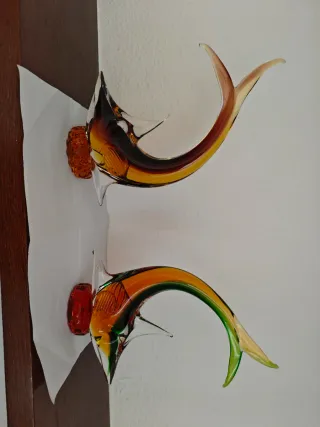 Elegante pareja de delfines decorativos, elaborados en cristal de Murano, muy bonitos. -Traidos de Italia. - Piezas de cristal soplado. - Base decorativa en color ámbar.