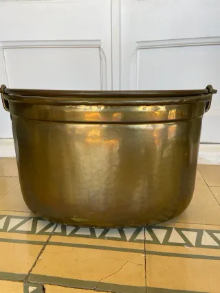 Hervidor/ Cesta Leña Antigua holandés de cobre o latón, también llamado 'aker'. Se utiliza para sacar agua del pozo y cocinar a fuego abierto. Cubo de latón holandés de mediados de siglo, años 30/50, de forma ovalada y elegante fabricación, con asa . Su uso original era almacenar o transportar leña para la chimenea. En su estado original, con desgaste visible y una pátina preciosa. El desgaste es acorde con su antigüedad y uso. Hashtag-Diseño Vintage Retro 1980 1970 1960 70s 80s 60s Sofá Mesa Butaca Sillon Mueble Colombo Knoll Eames Breuer Bauhaus Borsani Foscarini Hansen Gubi Fase Metalarte Tramo Gei
