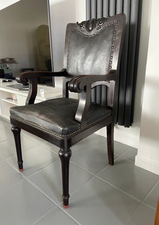 Elegante silla de despacho de estilo Neorrenacimiento, datada en la década de 1915- "Muebles & Decoración S.A., Barcelona " circa 1915–1930 – Madera de caoba tallada y cuero, tela. Ejemplar representativo del estilo Neorrenacimiento español, muy popular en Cataluña durante las primeras décadas del siglo XX. Estructura robusta , madera limpia.Hashtag =Colombo Knoll Eames Breuer Bauhaus Borsani Foscarini Hansen Gubi Fase Metalarte Tramo Gei Lupela Poulsen Milá Marset Polinax Artemide Jacobsen Le Corbusier Gubi Alessi. Aldo Tura Butaca