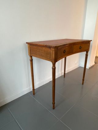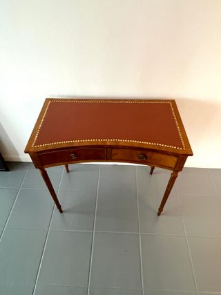 Mesita auxiliar/ consola/ escritorio/ de estilo neoclásico inglés, con un diseño elegante y refinado. - Encimera con acabado en cuero. - Dos cajones frontales con tiradore - Patas de madera torneada. Hastag Hashtag =Colombo Knoll Eames Breuer Bauhaus Borsani Foscarini Hansen Gubi Fase Metalarte Tramo Gei Lupela Poulsen Milá Marset Polinax Artemide Jacobsen Le Corbusier Gubi Alessi. Aldo Tura butaca sillon vintageHashtag =Colombo Knoll Eames Breuer Bauhaus Borsani Foscarini Hansen Gubi Fase Metalarte Tramo Gei Lupela Poulsen Milá Marset Polinax Artemide Jacobsen Le Corbusier Gubi Alessi. Aldo Tura