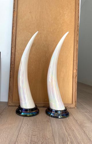 Elegante pareja de colmillo de elefante, hechos de cerámica iridiscente, montados sobre una base de cerámica. Italia anos 70s. Adornos decorativos Estilo Hollywood Regency para su escritorio, tocador o frente al espejo de su recibidor. Italia. Hashtag =Colombo Knoll Eames Breuer Bauhaus Borsani Foscarini Hansen Gubi Fase Metalarte Tramo Gei Lupela Poulsen Milá Marset Polinax Artemide Jacobsen Le Corbusier Gubi Alessi. Aldo Tura butaca