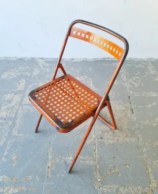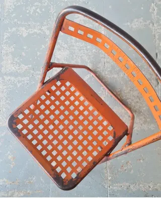 I N S T A G R A M para ver más mobiliario: @ lasperlasdelaabuela **HACEMOS ENVIOS** Entrega GRATUITA en Barcelona ciudad, para otras localidades consúltanos. Silla plegable modelo Plichaise producida la década de los 60 por la marca francesa Souvignet. Estructura de metal acabado en naranja. Pátina original que le otorga un aspecto industrial y retro. diseño chair comedor despacho escritorio mesa butaca lampara lighting design breuer mila knoll thonet cassina corbusier eames saarinen magistretti vitra colombo midcentury spaceage chaise siège