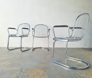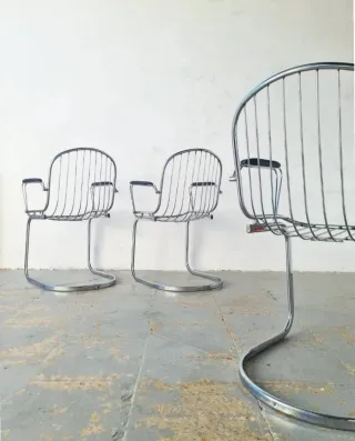 I N S T A G R A M para ver más mobiliario: @ lasperlasdelaabuela *HACEMOS ENVIOS* Entrega GRATUITA en Barcelona ciudad, para otras localidades consúltanos. Precio por unidad 200€. Sillas diseño Gastone Rinaldi para Rima, producidas en Italia en la década de los 70. Estructura de metal cromada con reposabrazos recubiertos en plástico color negro para un mayor comodidad. retro industrial estudio escritorio hierro pop memphis butaca design piretti mila knoll cassina kartell breuer panton eames vitra scarpa colombo pliante chrome table chair chairs chaises chaise Willy Rizzo Cidue 1806