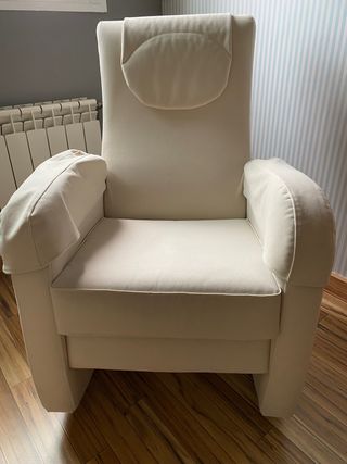 Se vende butaca en buen estado, muy cómoda. Tb es muy cómoda para lactancia. De tela blanco roto y patas de madera