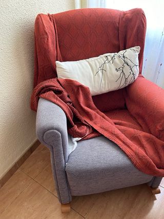 Butaca reclinable con un diseño moderno y cómodo. - Tapicería de tela. - funda únicamente puesta para evitar pelos de gato. Puedo enseñar estado por debajo de la misma. - Ideal para descansar y ver la tele. También para lactancia, ya que puede hacerse cierto balanceo (yo lo he usado para eso).
